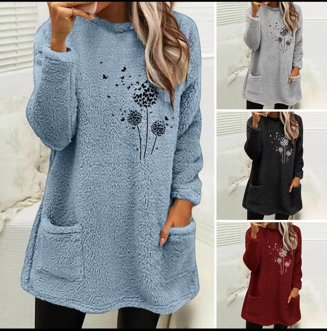 Plant Print Double-sided Velvet Pocket Round Neck Sweater